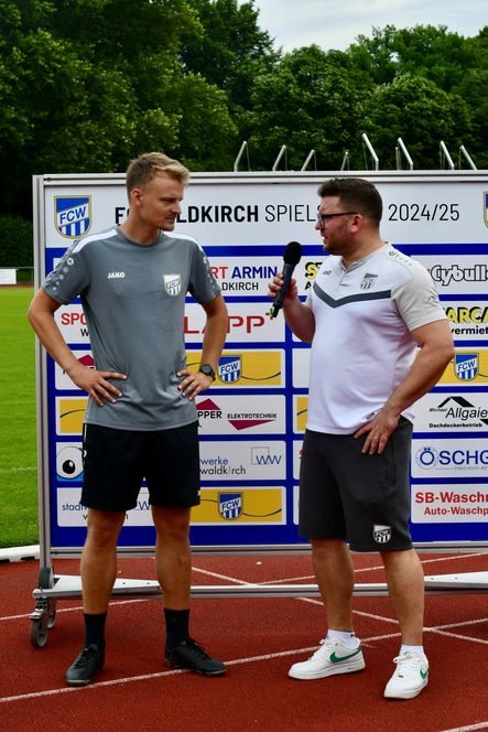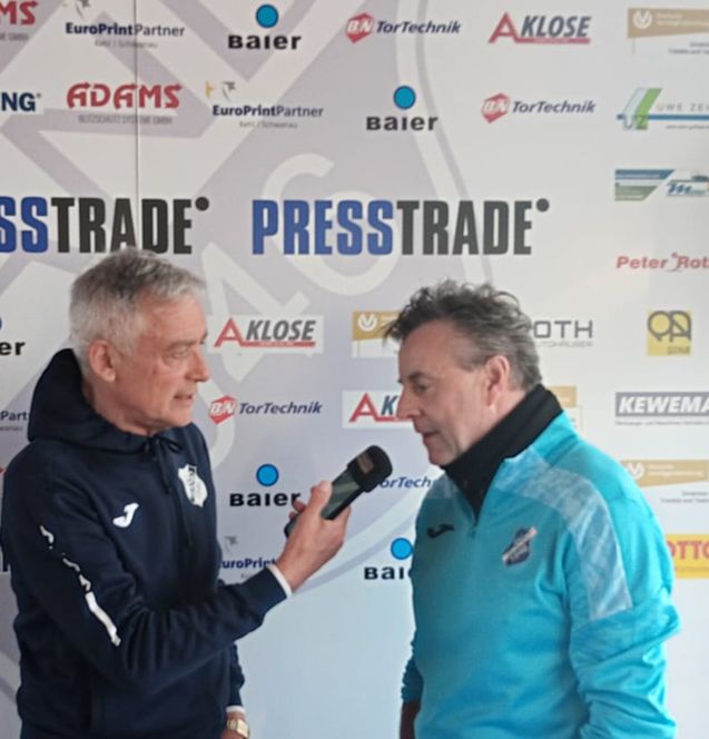 Trainer Alexander Fischinger hat mit den Frauen des SC Sand die Tabellenführung in der 2. Bundesliga zurückerobert, weil der VfB Stuttgart vor 31.000 Zuschauern gegen den FSV Mainz 05 verloren hat. "WIr brauchen noch zwölf Punkte, dann sind wir durch", glaubt Alexander Fischinger, auf dem Bild im Interview mit Manfred Schäfer.