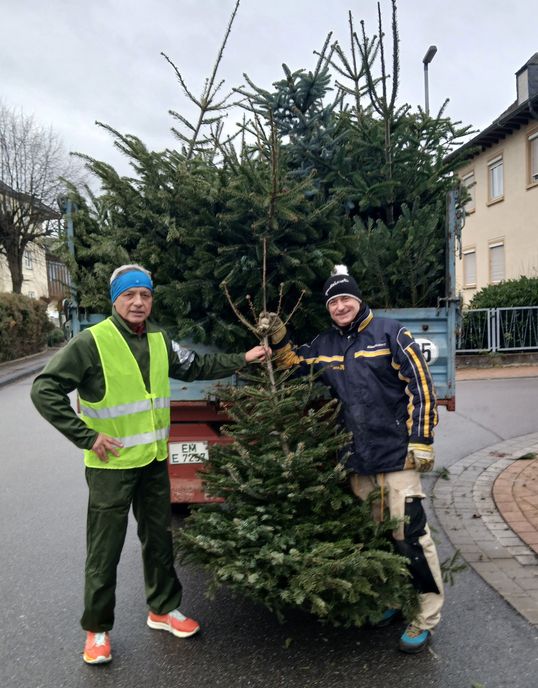 "Das war Lauf- und Krafttraining!" Die Fußballer des FV Herbolzheim begannen die Vorbereitungen auf die Rückrunde mit einem besonderen Programm. Mit fünf Zugmaschinen wurden im Stadtgebiet über 1000 Christbäume eingesammelt. Anschließend hat der stellvertretende Bürgermeister, ein Metzgereiinhaber, zu einer Stärkung eingeladen. Bild: MSC